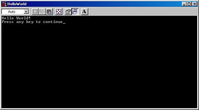 Wenn Sie das Programm erneut erstellen (Menüpunkt <Erstellen/Helloworld.exe erstellen>), dürfte es diesmal keine Fehler geben. Ausführen können Sie es nun über den Menüpunkt <Erstellen/Ausführen von HelloWorld.exe>. Das enstehende Fenster sollte nun so aussehen: